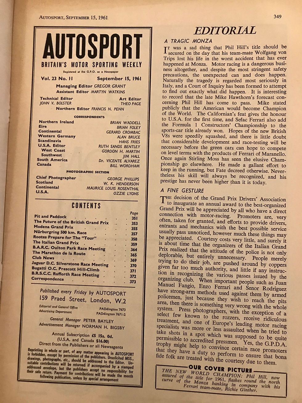 Autosport 15 September 1961 Obituary Von Trips Hill Ferrari Wins Italian F1 GP
