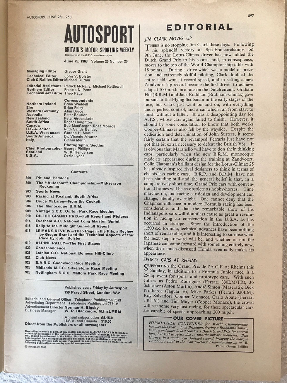 Autosport Magazine 28 June 1963 Jim Clark Lotus Wins Dutch F1 GP Le Mans Review