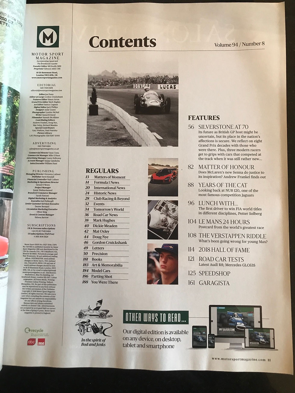 Motor Sport Magazine September 2018 Lunch John Barnard MV Augustan Story Moss