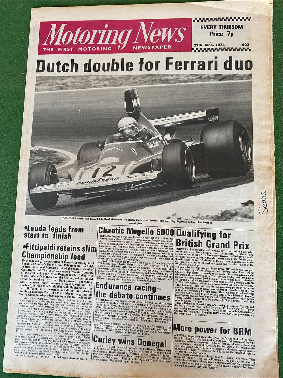Motoring News 27 June 1974 Lauda Ferrari Wins Dutch F1 GP Curley Donegal Legally